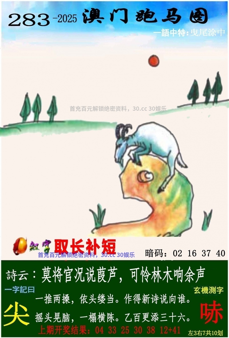 283期一字記曰:【尖】 一推两搡,依头缕当。作得新诗说向谁。摇头晃脑,一榻横陈。乙百更添三十六。【哧】 解:莫将官况说葭芦解蛇猴龙鼠牛马 综合取肖:蛇猴龙鼠牛马 |
